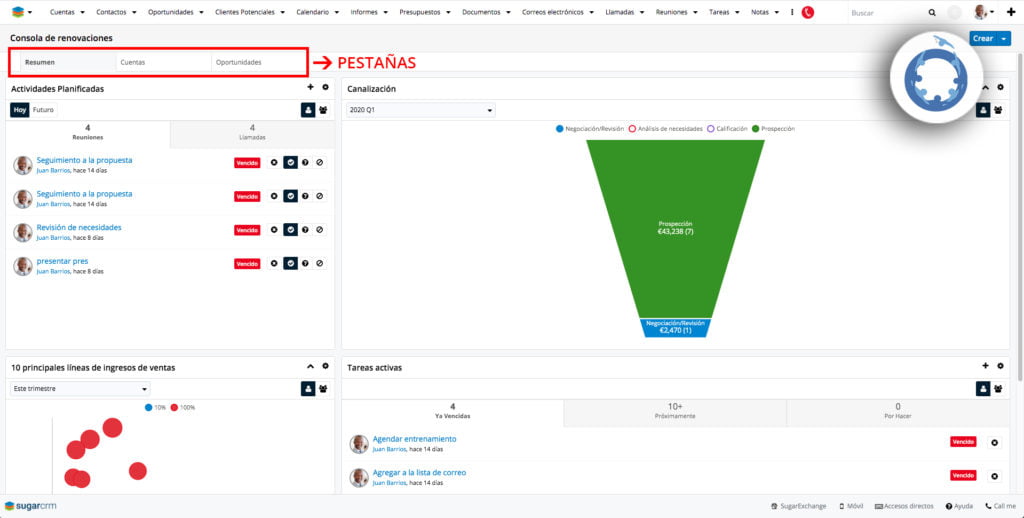 - Resumen: Aquí se encuentra, como bien indica su nombre, un resumen de la información de las oportunidades/cuentas/contacto relacionada con las renovaciones. Estos detalles se presentan con distintos modelos de gráficos o en forma de actividades planificadas o tareas, entre otras opciones.