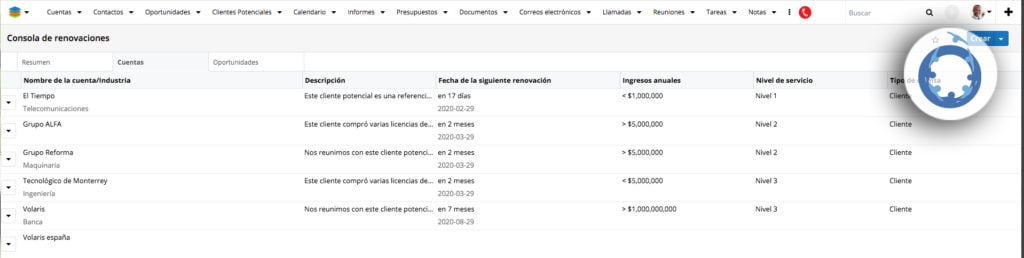- Cuentas: Esta pestaña, muestra las cuentas que tienen renovaciones pendientes. Aquí, encontraremos información correspondiente a la fecha de la próxima renovación, nivel de servicio, o una descripción que hayan añadido los usuarios, entre otras opciones. Todo ello ordenado por la fecha de vencimiento.
