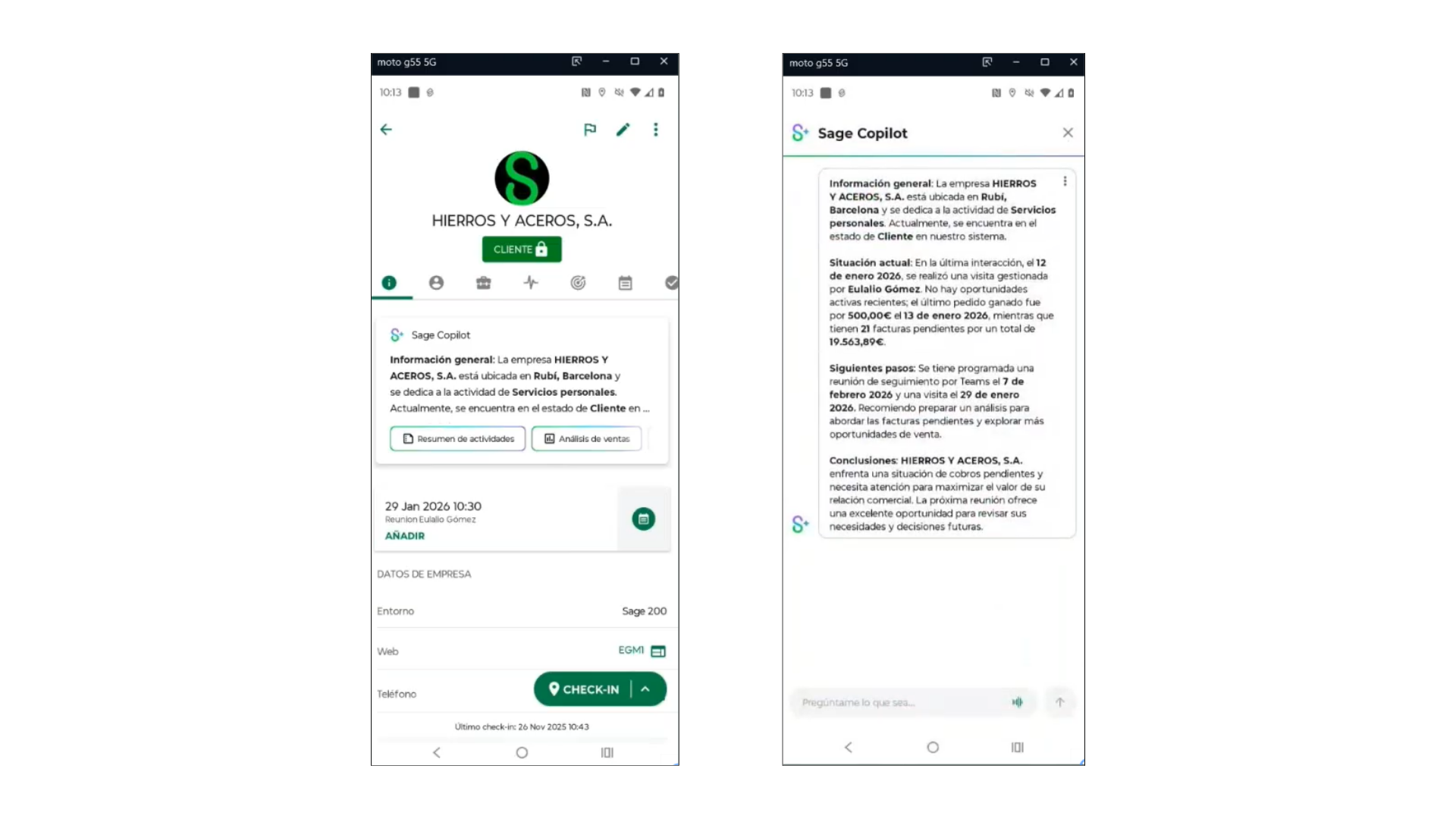 Aquí es donde Sage Copilot marca una gran diferencia. El comercial puede interactuar directamente con la IA para obtener respuestas rápidas y útiles: desde un resumen de todas las gestiones realizadas con un cliente hasta el estado actual de una oportunidad o la evolución de sus ventas. Esto evita tener que revisar múltiples pantallas o reconstruir información manualmente. En pocos segundos, tiene una visión clara de la situación.